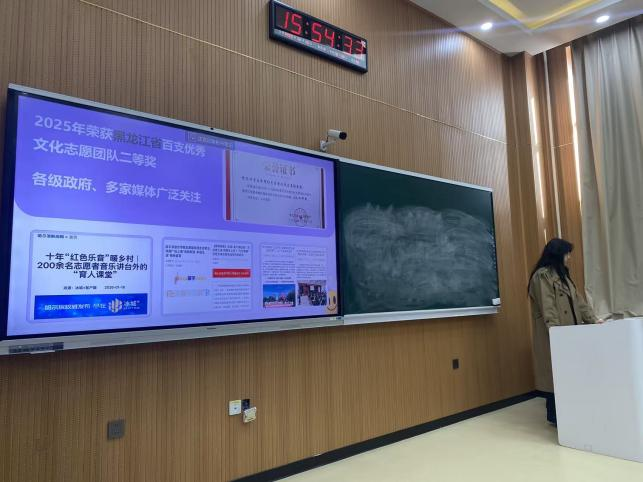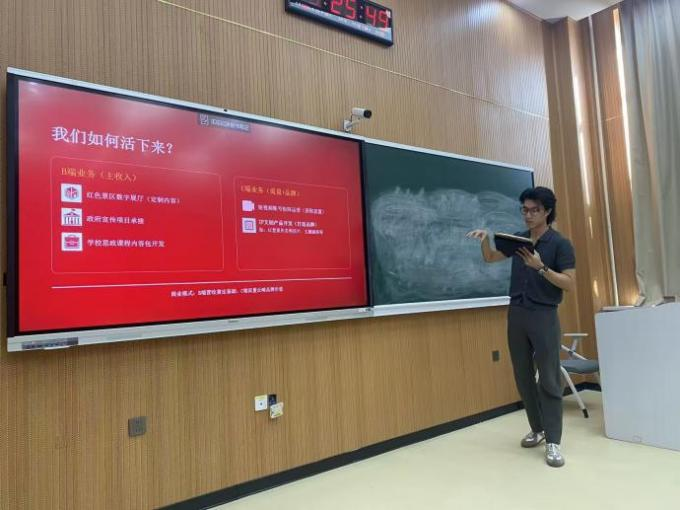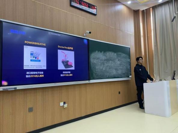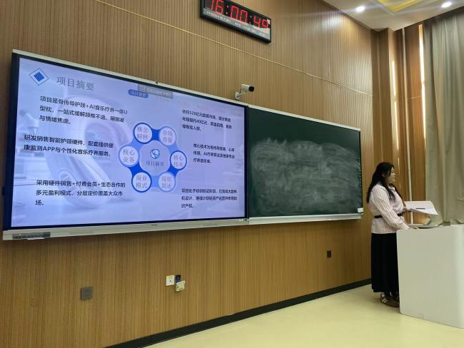 比赛路演环节有序开展,五位参赛选手依次登台,结合PPT展示、现场阐述,各项目特色鲜明、亮点纷呈:安彦儒带来《赛博草原》,融合新潮理念打造特色创意项目;邵茗昱围绕红色故事,宣讲《白水黑山间的英雄礼赞》,传承红色精神,挖掘文旅价值;刘征展示《智能气息训练器》,贴合声乐专业特色,聚焦技能训练创新;谭斯言以《音乐教育与文化创新传播助力乡村振兴》为题,立足美育发展,聚焦基层建设;蒋庆怡带来《音乐疗愈——骨传导U型枕》,紧扣实用需求,融合音乐疗愈与智能科技,兼具创意性与实用性。选手们从容答辩、条理清晰,精彩的路演赢得现场评委的赞赏。