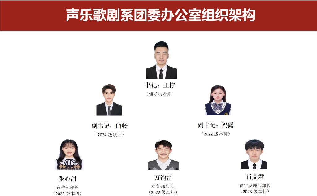 哈尔滨音乐学院声乐歌剧系团委是在学院党委与上级团组织领导下,引领全系青年成长成才的重要阵地。团委由书记王柠统筹全面工作,副书记闫畅、冯露协助分管各项事务,下设组织部、宣传部、青年发展部,形成权责明晰、协同高效的工作格局。