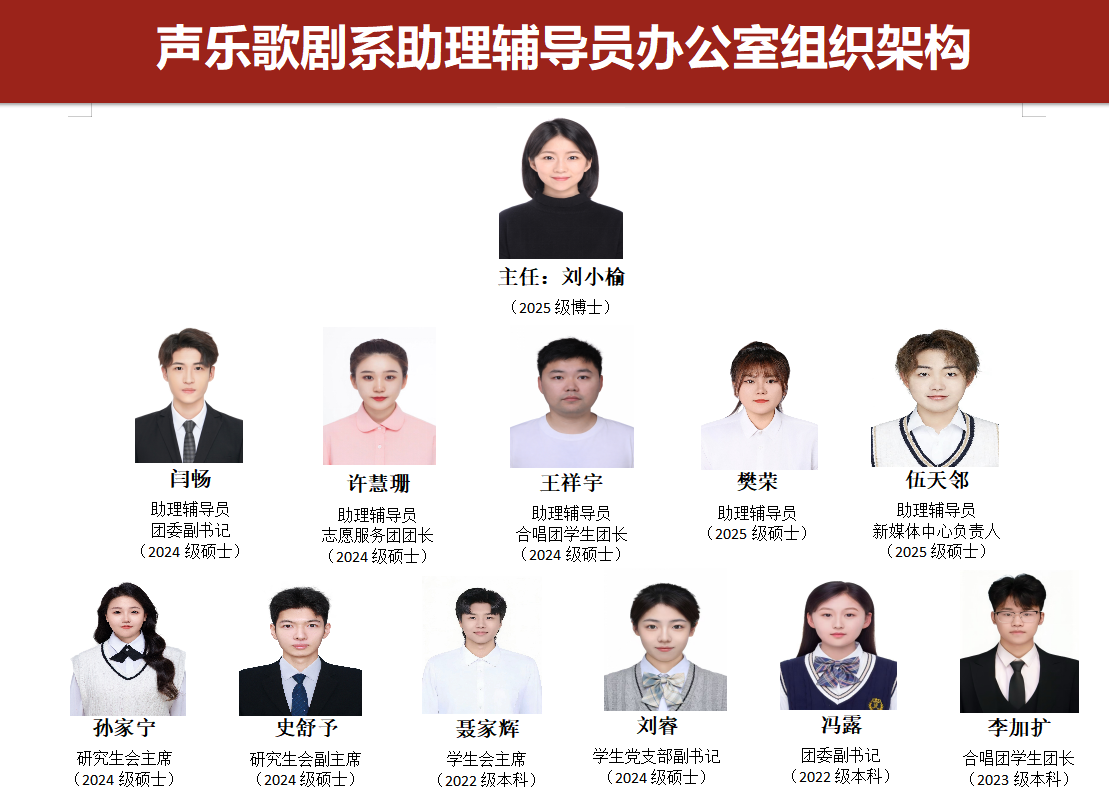 哈尔滨音乐学院声乐歌剧系学生助理员办公室,是声乐歌剧系助力学子成长、衔接师生沟通的专属服务阵地。作为系部与学生之间的重要纽带,办公室依托高年级优秀学子组成的助理辅导员团队,聚焦声乐专业精进、歌剧舞台实践、日常学业生活三大核心方向,统筹开展新生适应性指导、专业学习经验分享、班级建设统筹推进、心理关怀疏导帮扶等多项工作。这里不仅是政策传达、事务协调的服务窗口,更是声乐歌剧系学子交流专业心得、解决成长困惑、凝聚集体力量的温暖港湾,以专业、贴心的陪伴,护航每一位声乐歌剧追梦人的艺术之路。